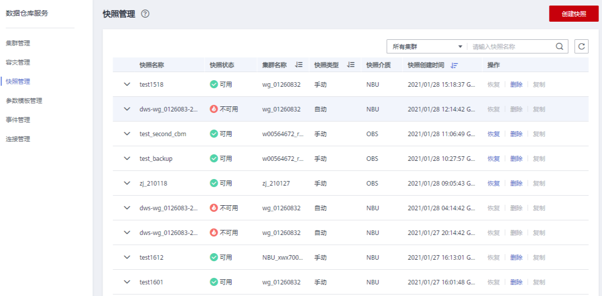 创建快照成功后,后期即可使用该快照来恢复集群。