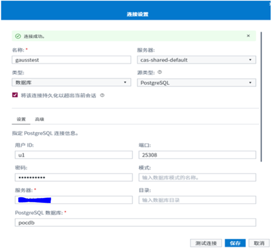 【摘要】 版本信息:产品名称: SAS® Drive发行版: 2.2.1SAS® Viya® 版本:V.03.051.配置odbc驱动2.查验驱动是否配置成功3.点击准备数据;4.点击新建计划;5.点击连接;6.填写数据库配置,并点击测试连接,验证通过后保存;名称:gausstest类型:数据库源类型:postgres用户ID:u1端口:25308密码:******服务器:*.*.*.*Postgre...