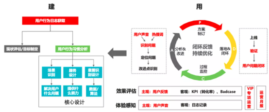 以往在做产品时,往往选择的是技术驱动,但智能产品,尤其是智能助手这类产品,往往运营、场景和数据作为驱动的。在构建智能助手时,往往需要会先获取用户行为日志,然后基于用户行为习惯进行分析,最终实现场景识别、服务设计、意图识别设计等核心能力;同时也可以将之用于现状评估和目标制定。