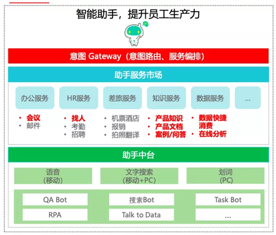 总体来看,信息获取方式经历了“人找服务”到“服务找人”的升级,事实上,这也是下一代数字化服务的特点,由主动获取信息变成信息整合后的被动获取,进而盘活企业数字资产,提升员工生产力。智能助手作为一种面向未来的信息获取方式,那么其是如何构建的呢?