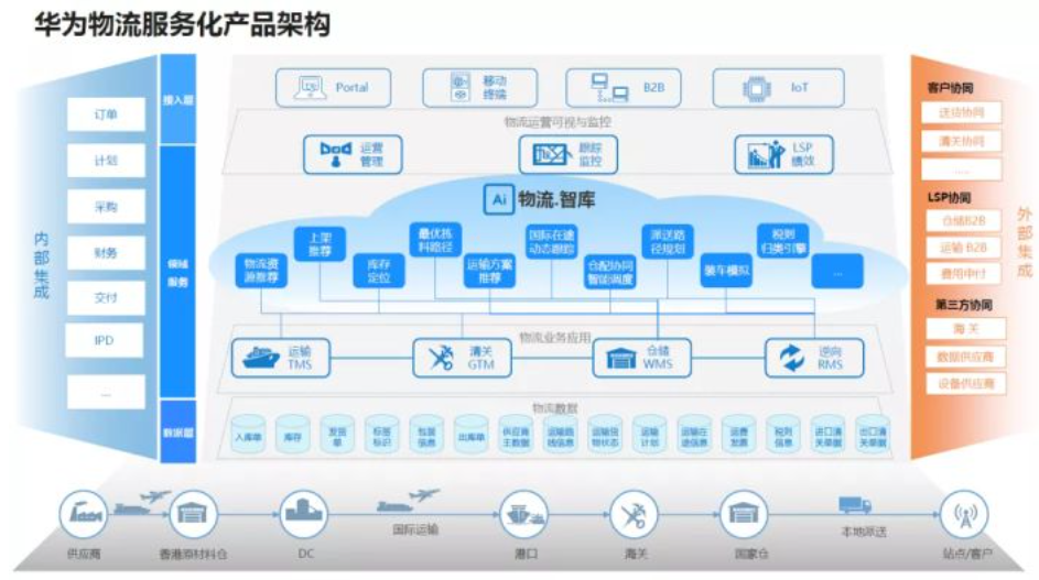 从华为物流服务化的产品架构来看,分为数据层、领域服务和接入层的“三层架构”。在数据层的数据信息打通之后,各环节实现了信息的透明共享,这才让领域服务中的物流智库在发挥出核心作用。它不仅仅是提供像最优拣料路径算法、派送路径规划算法等逻辑及技术服务用于提升体系效率,同时更重要的功效是通过 AI 将华为物流逐渐积累的宝贵经验存储起来,并且不断“进化”。配合物流运营的可视化与监控,华为对自己内部的物流体系有了更强的掌控力,这让华为物流内部的发展和决策甚至都能被轻松呈现出来。