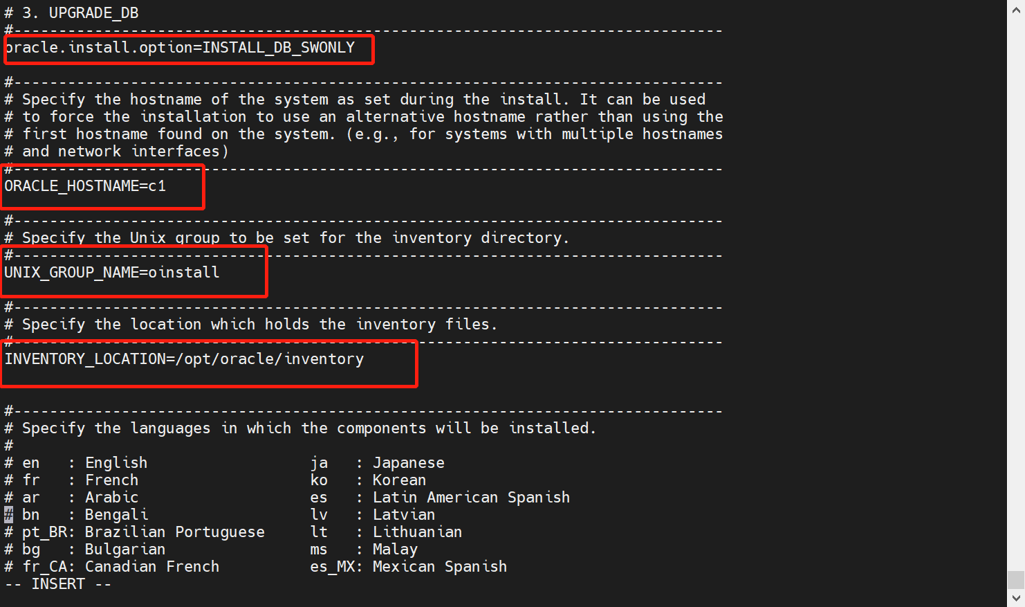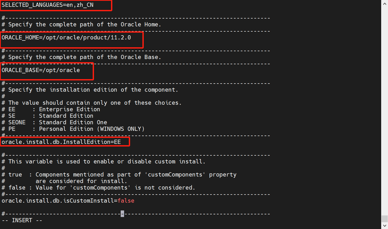 vi /opt/oracle/database/response/db_install.rsp #配置静默安装文件,配置内容如下,耐心配置,一 一对应