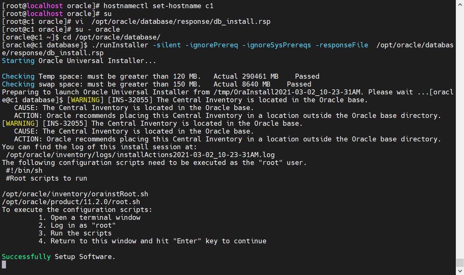 ./runInstaller -silent -ignorePrereq -ignoreSysPrereqs -responseFile /opt/oracle/database/response/db_install.rsp