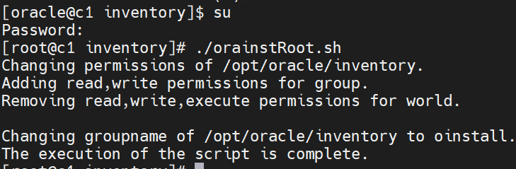 su #切换root用户,输入密码(由于之前切换到了oracle用户,所以要切换回root用户才能执行sh脚本)