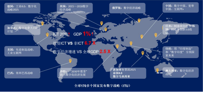 如下图趋势,全球共计170多个国家发布数字战略,数字经济成为新的增长模式。美国提出建设工业互联网,德国发布工业4.0战略,中国的《十四五规划》明确提出加快新一代信息技术及高端装备制造的产业发展,加快第五代移动通信、工业互联网、大数据中心等建设,推动互联网、大数据、人工智能等同各产业深度融合。
