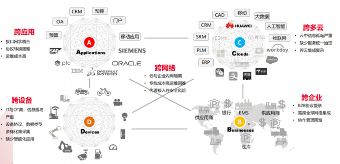 - B跨企业(Businesses):B2B协议复杂;需跨网全球网络集成;协作管理困难。