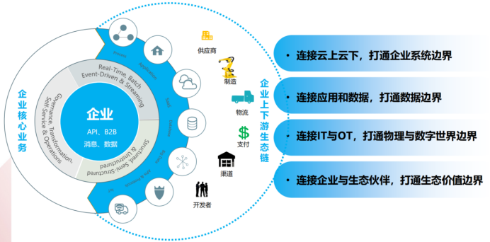 企业数字化转型需实现广泛的开放和连接,打通企业系统边界、数据边界、物理与数字世界边界、生态价值边界,连接云上云下资源、连接IT与OT、连接企业与生态伙伴,通过商业价值驱动,打造生态链。