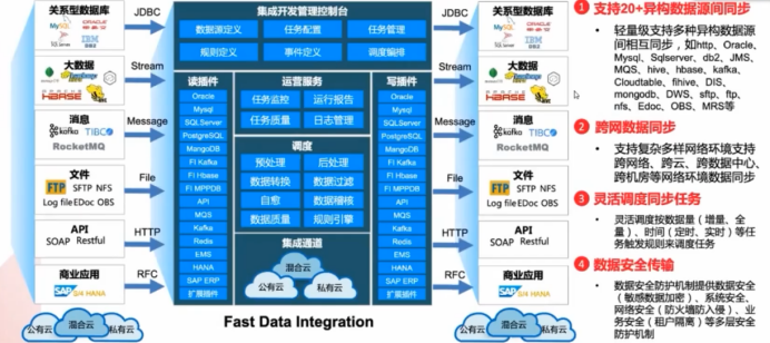 轻量级支持多种异构数据源间相互同步,如http、Oracle、mysql、SqlServer、db2、JMS、MQS、hive、hbase、kafka、Cloudtable、fihive、DIS、MongoDB、DWS、sftp、ftp、耐腐蚀、Edoc、BOS、MRS等。