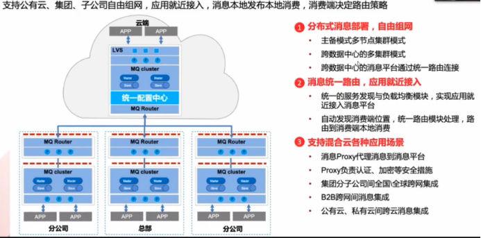 支持公有云、集团、子公司自由组网,应用就近接入,消息本地发布本地消费,消费端决定路由策略。