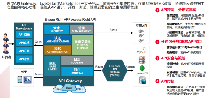 通过API Gateway、LiveData和Markerplace三大产品,聚焦在API集成拉通,存量系统服务化改造,全球跨云数据中心路由等核心功能,涵盖从API设计、开发、测试、管理到发布的全生命周期管理。