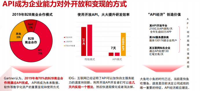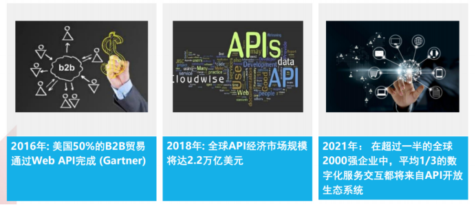 API经济这个词并不陌生,早上2014年,从SOA架构开始改造,提出服务化和微服务化的概念。2016年美国有50%B2B贸易通过Web API完成,到2018年全球API经济市场规模达到2,2万亿美元,我们预测在2021年在超过一半的全球2000强企业中,⅓的数字化服务交互都将来自API开放生态系统。