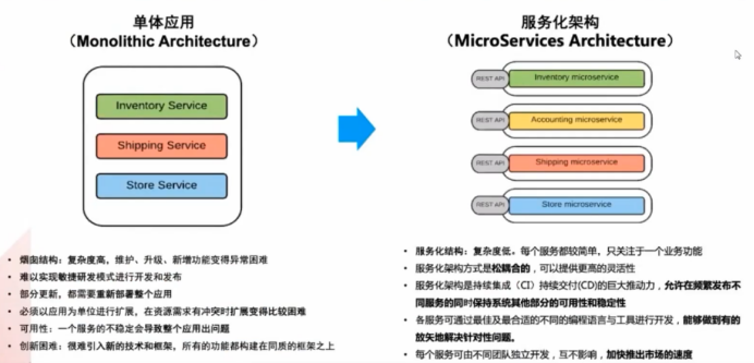 应用从单体架构向微服务架构的转变,将传统笨重的巨石型的应用打碎,变成细小的积木块,每个积木块都是一个业务模块,模块间通过Restful API的通信。微服务架构提供了更高的灵活性,推动了持续集成/持续交付的发展,加快业务上线速度。