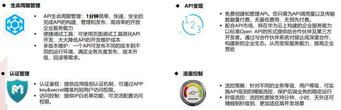 API生命周期管理:1分钟简单、快速、安全的完成API的构建、管理和发布,高效率的开放企业服务能力;