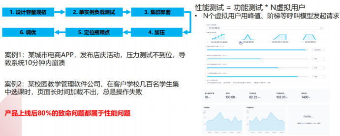测试流程:设计容量规格-单实例负载测试-集群部署-加压-定位瓶颈点-调优。