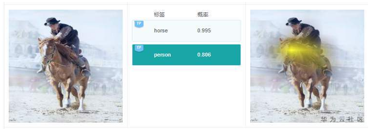 例7.2.1:原图中,有人,在预测标签中有1个标签是“person”,这个结果是对的;但是选择“person”标签,在查看右边解释的时候,可以看到高亮区域在马头上,那么这个关键特征依据很可能是错误的。