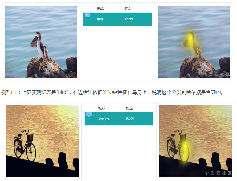 例7.1.1:上图预测标签是“bird”,右边给出依据的关键特征在鸟身上,说明这个分类判断依据是合理的。