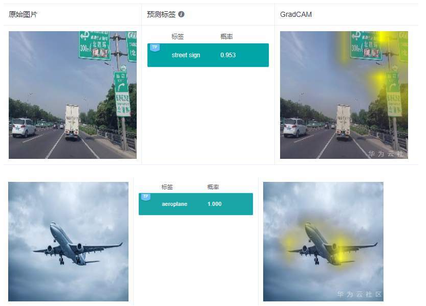 可以看到GradCAM的解释结果定位性和可理解性比较好,高亮区域集中在具体的特征上,用户可以通过高亮区域判断出和预测结果相关的特征。对于标签“路牌”,图像中的路牌被高亮,对于标签“飞机”,图像中的飞机被高亮,即GradCAM认为路牌区域和飞机区域是2个分类结果的主要依据。