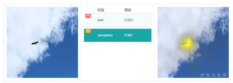 例7.3.2:图中有一个分类预测结果是“aeroplane”,但图中并没有飞机。从标签“aeroplane”的解释结果看,高亮区域在鹰的身上。打开飞机相关的训练数据子集,发现很多情况下训练图片中飞机都是远处目标,与老鹰展翅滑翔很像,猜测可能是这种原因导致模型推理的时候,误将老鹰当做飞机了。模型优化的时候,可以考虑增加老鹰滑翔的图片比例,提升模型的区分和辨别能力,提高分类准确率。