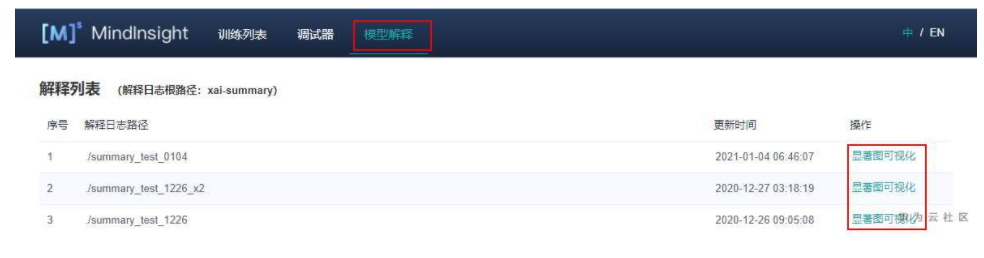 启动MindInsight系统,在顶部选择进入“模型解释”模块。可以看到所有的解释日志路径,当日志满足条件时,操作列会有“显著图可视化”的功能入口。