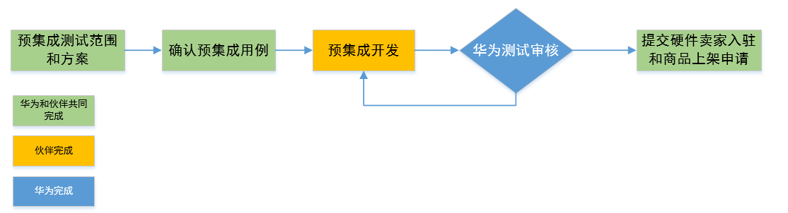 “预集成测试范围与方案”:华为方和伙伴方共同交流确定,主要是确定与华为云IoT的预集成范围,如是否使用设备分析云服务服务、要集成哪些行业应用等,并商讨出完成计划。