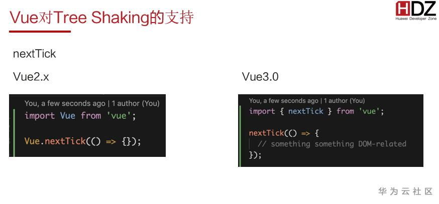 通过这个对比,我们可以看到使用VUE2的时候,即使没有nextTick或者其他方法,但由于它是一个GLOBA API,它一定会被挂载到一个实例上,最后打包生产代码的时候,会把这个函数给打包进去,这一段代码进而也会影响到文件体积。在VUE3.0如果不需要这个模块的话,最后打包的这个文件里边就不会有这一块代码。通过这种方式就减少了最后生产代码的体积。