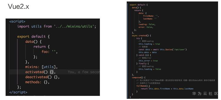 接下来我们再看一个Composition的例子:左边是在Vue2中最常用的一段代码,首先在data里边声明first name和last name,然后在回帖的时候去请求接口,拿到接口返回到值,在computed之后获取他的full Name。那么,这段代码的问题是什么呢?