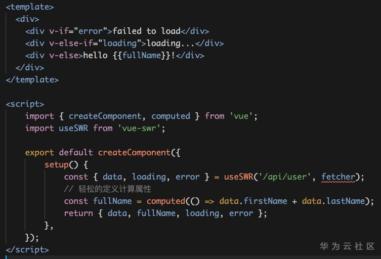 请求接口之后,直接拿到它的返回数据,然后把这个返回数据的值赋给computed函数里,这里就可以拿到full Name。通过这段代码可以看到,逻辑是更加的聚合了。