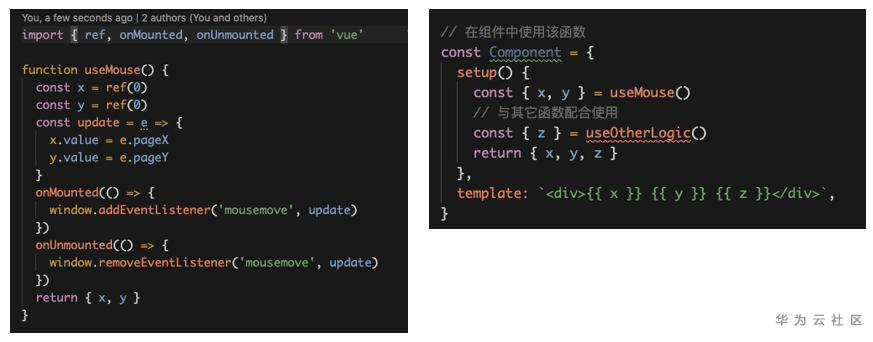 如果使用的是Vue3.0 的Composition,该怎么规避这个问题呢?如上图所示,假设它是一个组件实例,我们使用useMouse函数并返回了X和Y两个变量。从左边代码可以看到useMouse函数就是根,它监听了鼠标的移动事件之后,返回了鼠标的XY坐标。通过这种方式来组织代码,就可以很明确的知道这个函数返回的变量和改变的值。