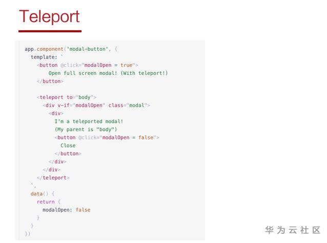 Teleport其实就是React中的Portal。Portal 提供了一种将子节点渲染到存在于父组件以外的 DOM 节点的优秀的方案。Teleport提供一个Teleport的组件,会指定一个目标的元素,比如说这里指定的是body,然后Teleport任何的内容都会渲染到这个目标元素中,也就是说下面的这一部分Teleport代码,它会直接渲染到body。