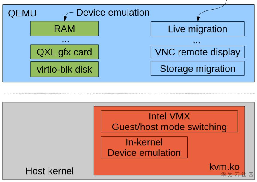 - QEMU-KVM的内存虚拟化由QEMU和KVM实现, KVM类似资源管理和提供者, QEMU类似资源的申请和使用者,同时QEMU从guestos角度来看是虚拟设备的提供者