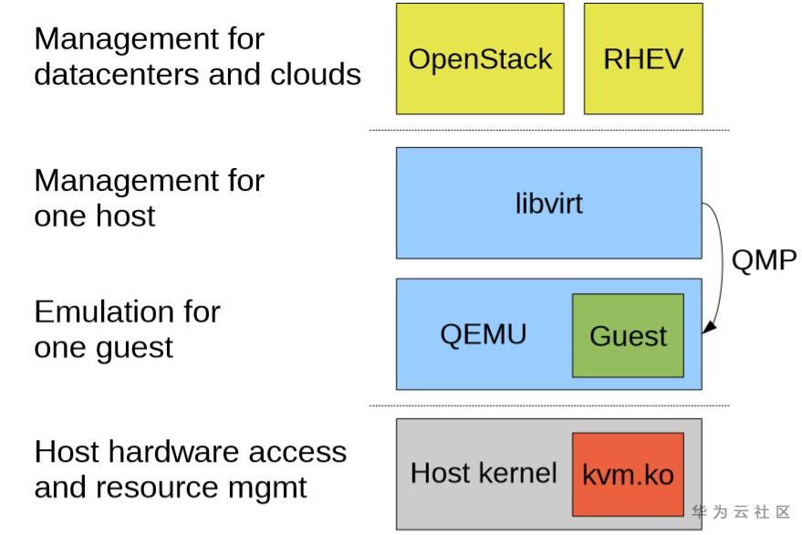 - kvm在整个技术栈中承担硬件操作和资源管理的角色,QEMU承担提供虚拟设备的角色。
