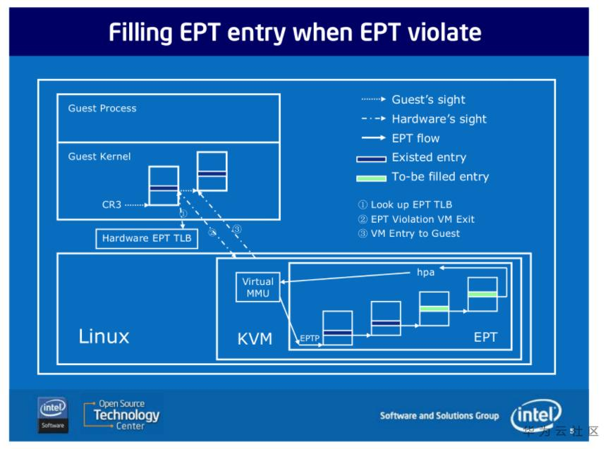 - 如上图,在 Guest OS 运行时,Guest 对应的 EPT 地址被加载到 EPTP,而 Guest OS 当前运行的进程页表基址被加载到 CR3。于是在进行地址转换时,首先通过 CR3 指向的页表实现 GVA 到 GPA 的转换,再通过 EPTP 指向的 EPT 完成 GPA 到 HPA 的转换。当发生 EPT Page Fault 时,需要 VM-EXIT 到 KVM,更新 EPT。