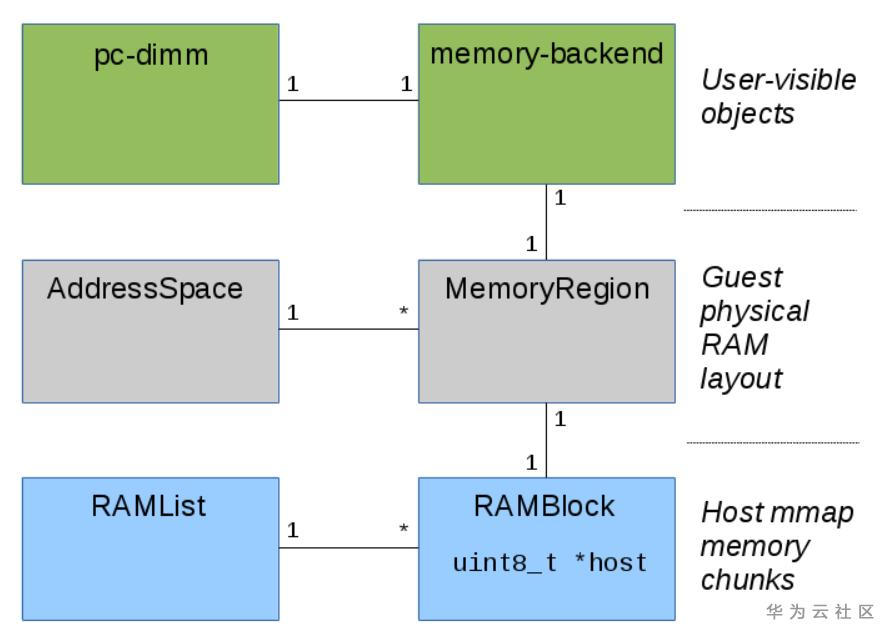 - RAMBlock: RAMBlock ram_block才是真正分配了host内存的地方,如果把它直接理解成一个内存条也是非常合适的,但实际上不仅仅如此,还有设备自有内存,显存。它的主要元素就是mr,host, offset和used_length,size,addr,每一个ramblock都有一个对应的MemoryRegion。
