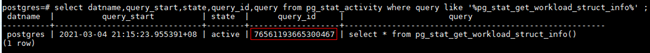 如下select datname,query_start,state,query_id,query from pg_stat_activity where query like '%pg_stat_get_workload_struct_info%' ,通过以下视图可知当前作业正在执行(active),且query_id为76561193665300467。