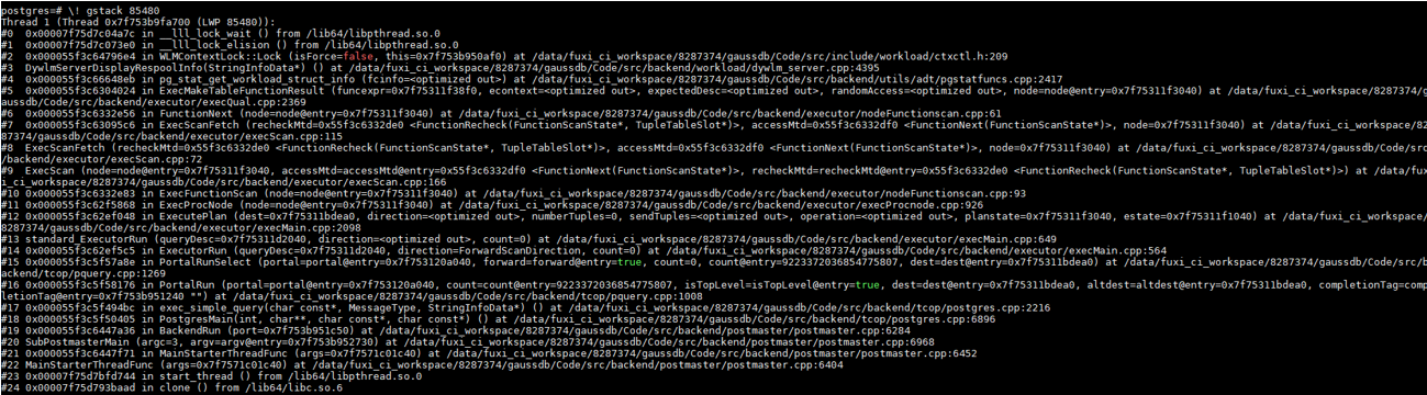 3、gstack打印问题线程堆栈,通过堆栈确认问题来源,多次打印,如堆栈一直在动,则查询在正常执行,如果一直未动,则可能发生hang。