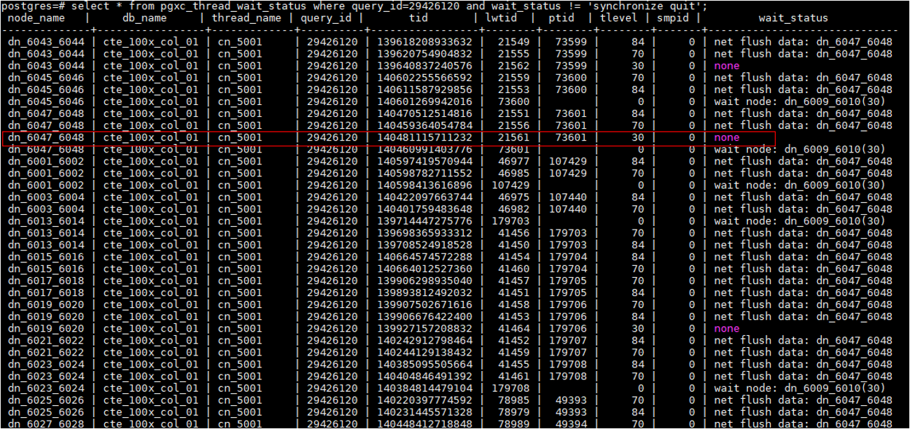 以上作业比较简单,有时会有比较复杂的作业,就需要理清各线程之间的等待关系,如下图的复杂查询,所有的线程都在等待dn_6047_6048(等待其他DN的最后也都在等待dn_6047_6048,1在等2,2在等3,最终都是在等3),而dn_6047_6048上的线程21561状态为none,需要打印出其堆栈来确认问题点。