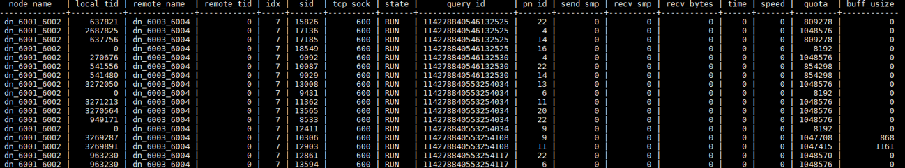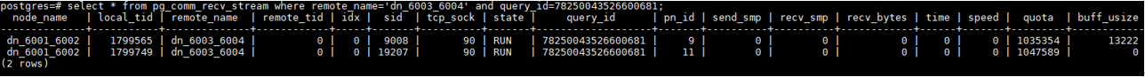 如果所有线程一直hang在发送或者接收数据上,就需要通过视图查询线程的数据接收和发送有无问题,pg_comm_recv_stream和pg_comm_send_stream:DN上所有的通信库接收与发送流状态。如下图为dn6001从dn6003接收数据的各线程信息,根据quota判断线程是否有数据在传输,并进行多次查询对比。