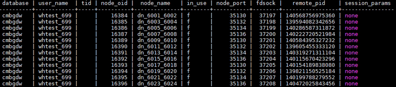 查询CN上pooler中的缓存连接状态,查询当前CN与所有DN的连接,是否在使用状态。