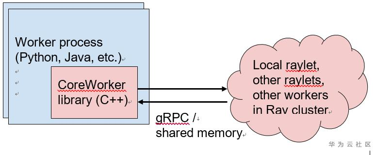 - 所有Ray核心组件都是用C++实现的。Ray通过一个名为“core worker”的通用嵌入式C++库支持Python和Java。此库实现ownership表、进程内存储,并管理与其他工作器和Raylet的gRPC通信。由于库是用C++实现的,所有语言运行时都共享Ray工作协议的通用高性能实现。