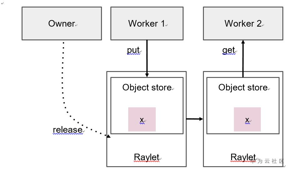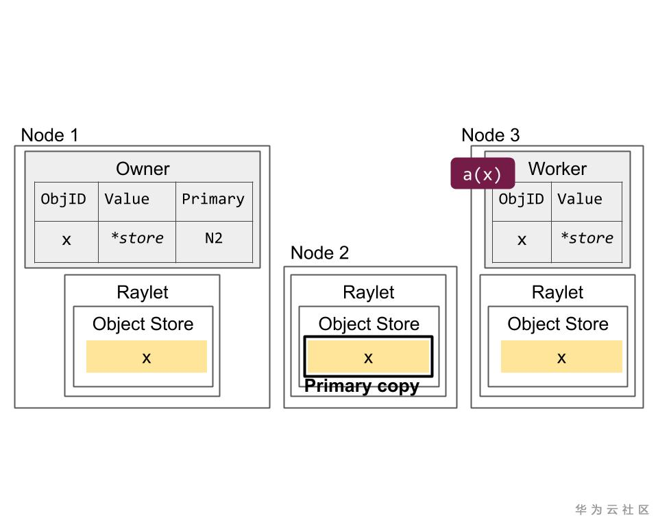 - 远程任务的对象值由执行的worker计算。如果值较小,工作线程将直接将值回复给owner,该值将复制到owner的进程中存储;如果该值较大,则执行工作程序将该值存储在其本地共享内存存储中,共享内存对象的此初始副本称为主副本。
