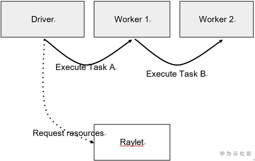 Owner负责确保提交的Task的执行,并促进将返回的ObjectRef解析为其基础值。如下图,提交Task的进程被视为结果的Owner,并负责从raylet获取资源以执行Task,Driver拥有A的结果,Worker 1拥有B的结果。
