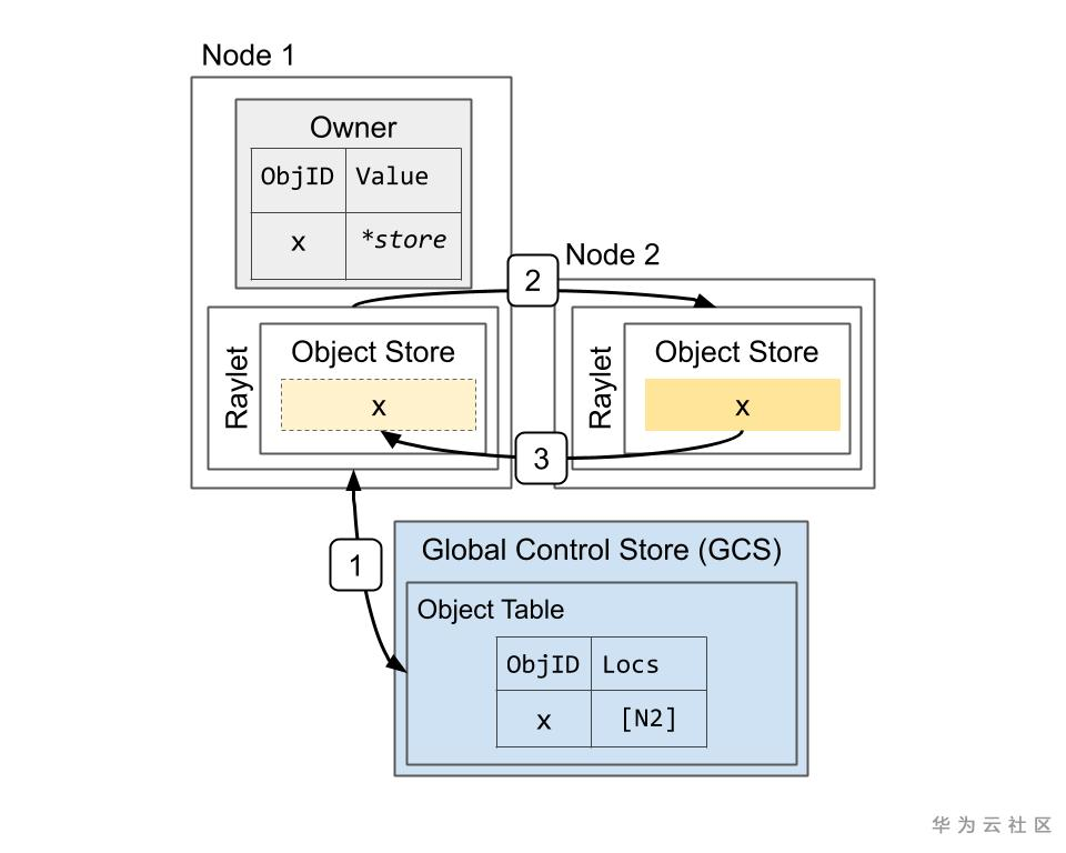 上图为大对象解析,对象x最初是在节点2上创建的(例如,返回值的任务在该节点上运行),所有者(任务的调用者)调用ray.get时的步骤: