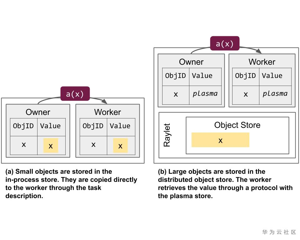 2.将ObjectRef作为参数传递给任务。执行工作程序将解析ObjectRefs,并将任务参数替换为解析的值。 - 当对象较小时,可以通过直接从owner的进程内存储中检索它来解析。大对象存储在分布式对象存储中,必须使用分布式协议解析。
