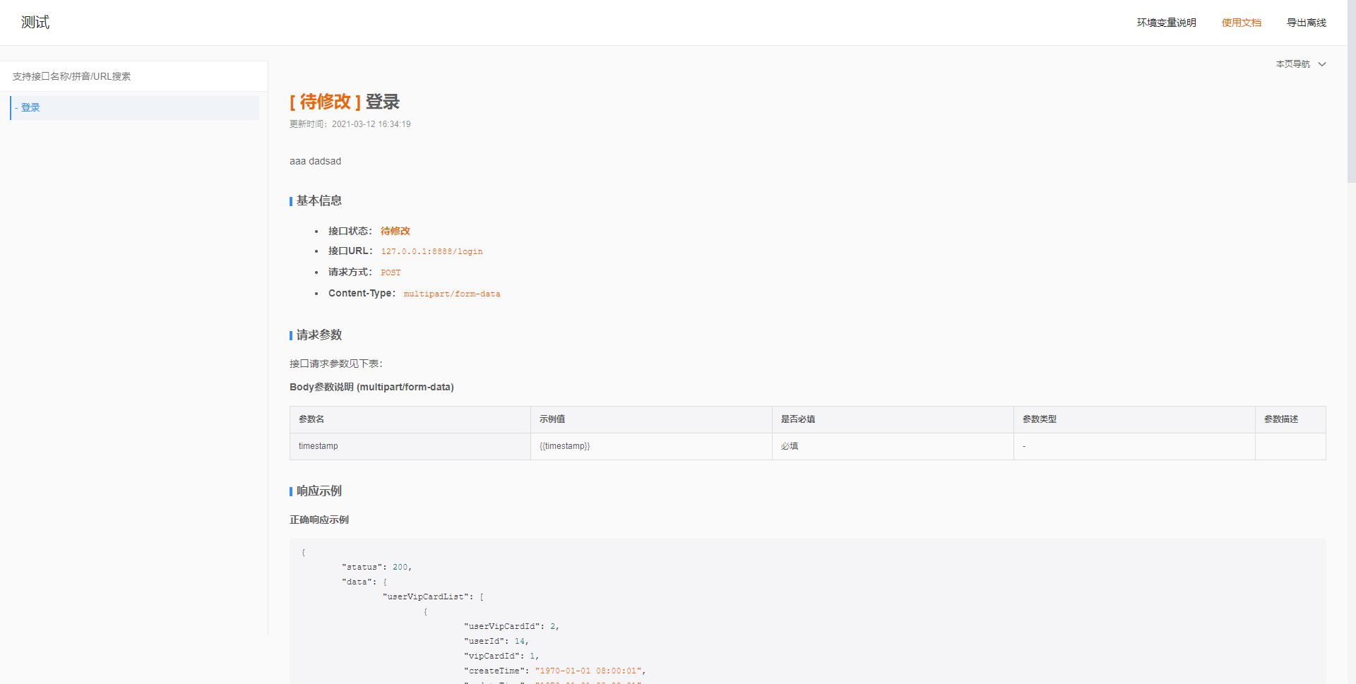 接口文档内容包括 接口请求参数描述,接口响应参数描述,接口请求数据描述,接口之间逻辑描述,接口请求案例,接口响应案例