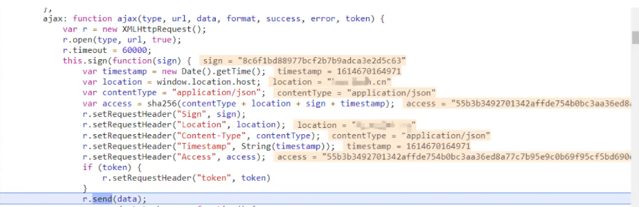 断点断住的位置是ajax请求发出的位置,在这个位置可以看到我们需要分析的access参数已经找到了
