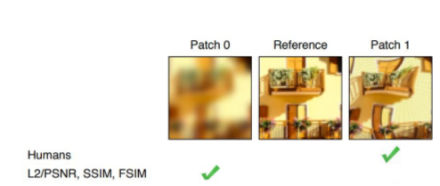 传统的评价算法主要有PSNR,SSIM,VMAF,然而表现并不好。基于深度学习的修复增强算法,输出信号特征与原图差异巨大。举个例子:图片Reference经过一定处理以后,如果用传统的评价算法,得出的是Patch0,而我们主观评价是Patch1. 说明传统评价算法与主观评价算法不太一致,这就需要新的评价算法。