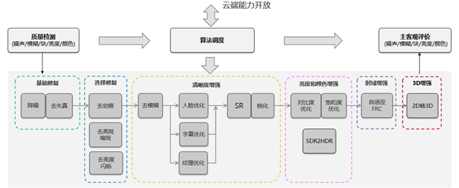 为了使修复做到轻量化、低成本以及自适应,华为云视频云构建了一整套电影修复技术架构。该架构包括质量检测、算法调度以及主客观评价三个环节,具体如下:
