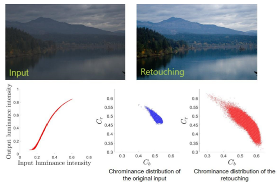 现有基于深度学习的对比度和饱和度增强算法,由于数据的不足,难以达到好的效果。华为云视频云通过寻找图像在亮度和色彩空间的统计规律,作为网络先验输入,能较好解决数据问题。