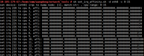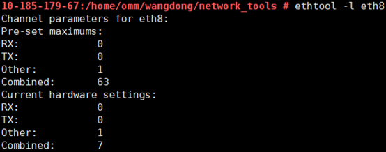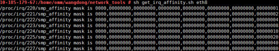 也可使用脚本工具get_irq_affinity.sh检查,如图2,从右向左看,每一位表示一个16进制,第一位的1表示在第1个核上,即CPU0,2表示在第2个核上,4表示第3个核上,以此类推。此网卡共绑定了5个核,可以使用ethtool命令查看,如图3,可设置的最大队列为64,当前设置队列为8。