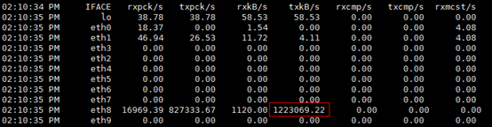 若此时流量与网卡上限相差很大,可以尝试使用speed_test工具压测,观察流量是否存在瓶颈。如图6、7,此时万兆网卡发送速度已至上限。